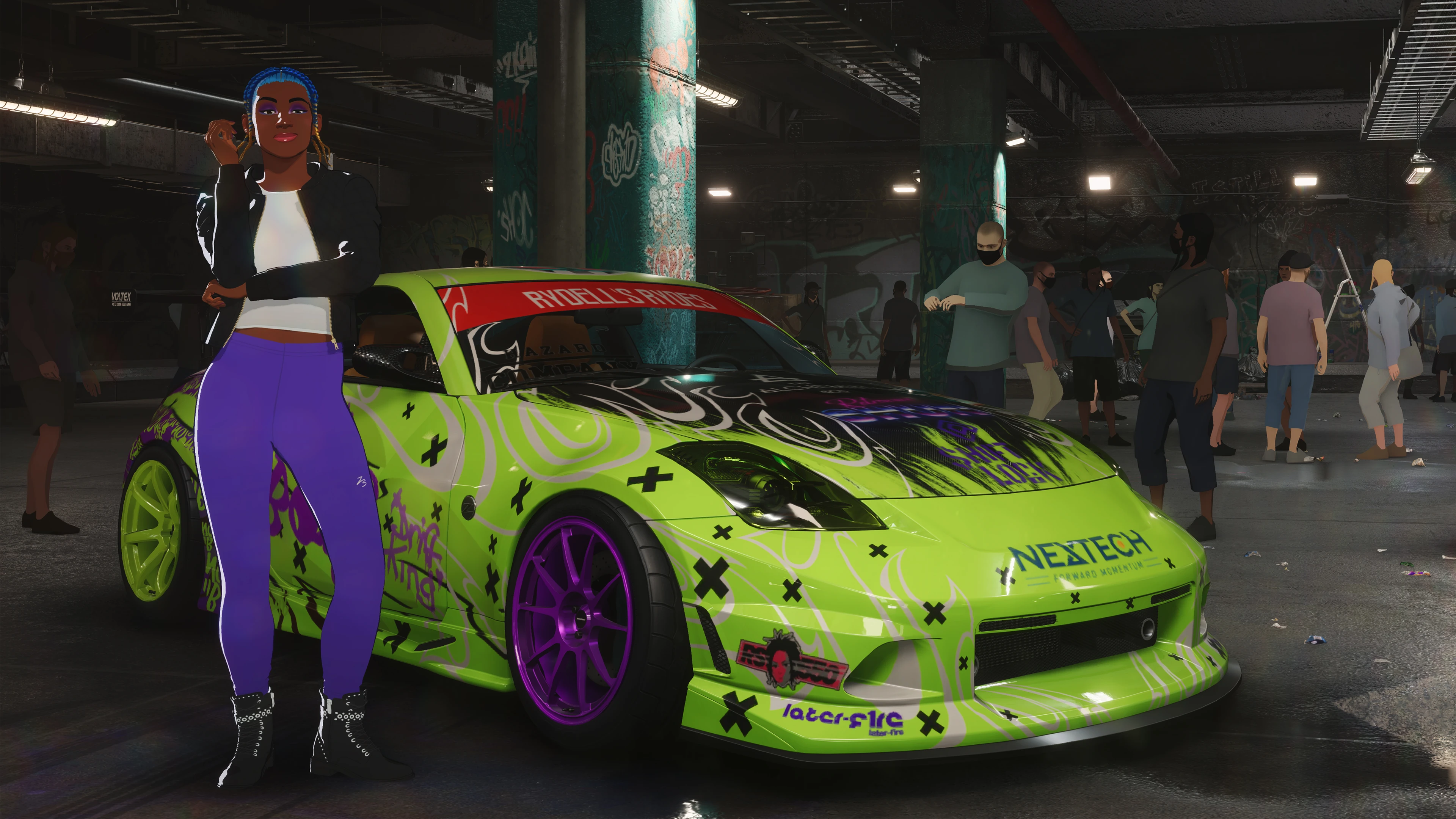 Justicia drives a custom Nissan 350Z (2008) in Tier B, A, A+, S, and S+ events. It can be unlocked in Story Mode and Lakeshore Online by defeating her in the Underground League.