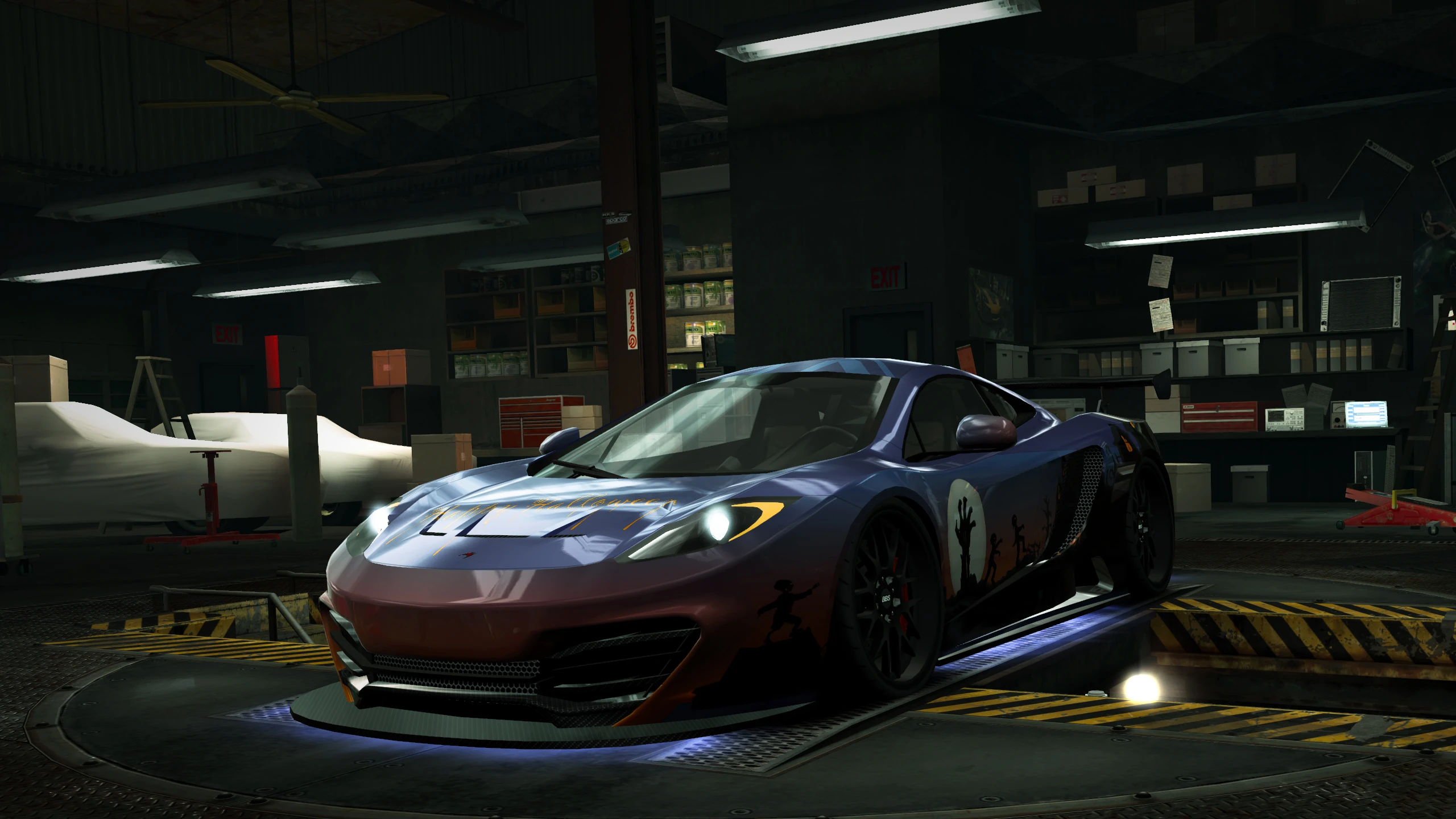 It is fitted with tuned quality Gromlen performance parts, 2-star Skill Mods, a selection of aftermarket parts, a special speaker can be triggered by pressing 'K' to play a series of zombie moans, and a unique spoiler with an LED lit "BOO!" across the rear of it.